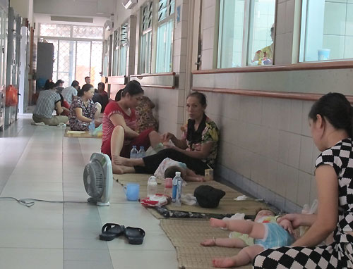 Giường nằm ghép 2,3; nhiều cha nội mẹ tranh thủ buổi trưa đưa con ra ngoài hành lang nằm cho thoáng. Ảnh: Hà Linh.